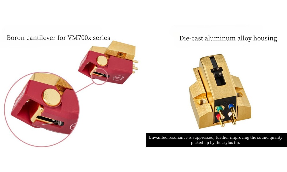 The high-grade models featuring Line Contact styli, AT-VM760xSL, AT-VM750xSH, and AT-VM745xML, utilize boron for their cantilever material. Its excellent vibration transmission speed enables quick and precise sound transients. The AT-VM740xML, on the other hand, employs an aluminum tapered pipe, offering two choices for MicroLinear styli alongside the AT-VM745xML.