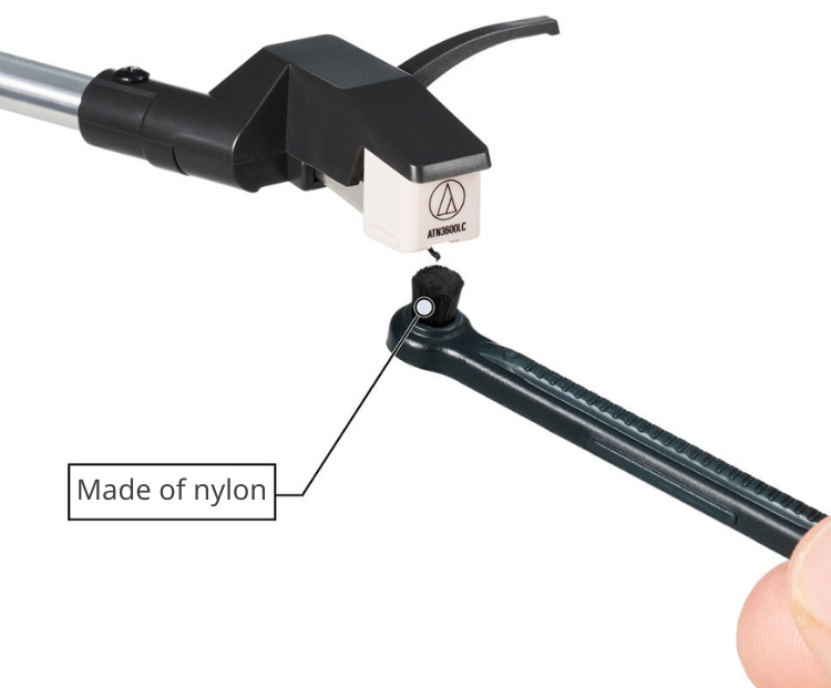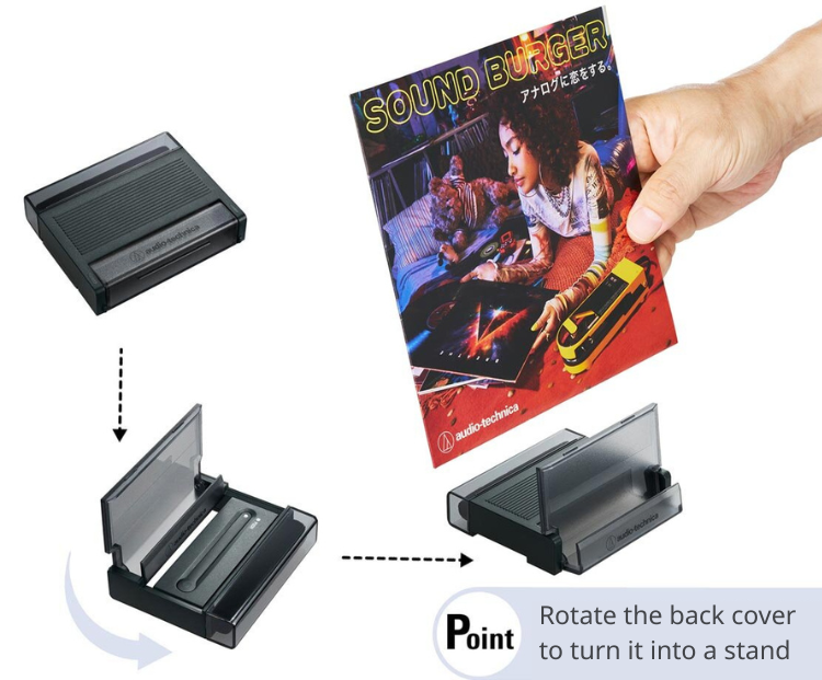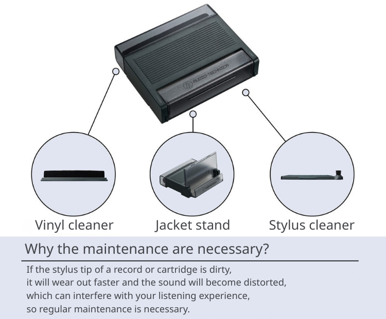 Allows maintenance of vinyl records and stylus. 3-in-1 tool with integrated jacket stand.