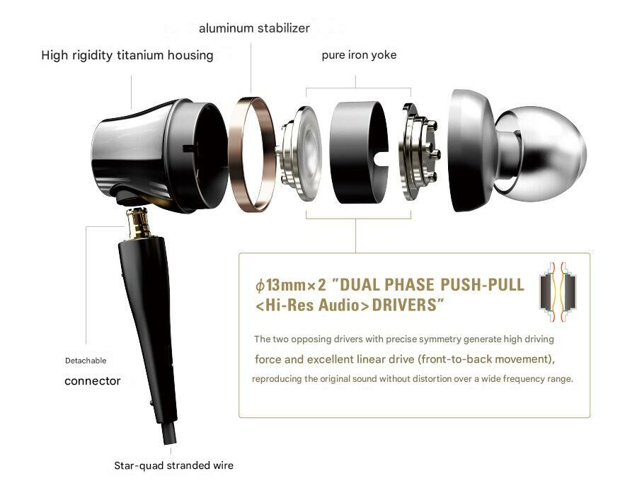 DUAL PHASE PUSH-PULL DRIVERS” with pure iron yoke. The true sound you can enjoy in the highly rigid titanium housing with excellent acoustic characteristics.