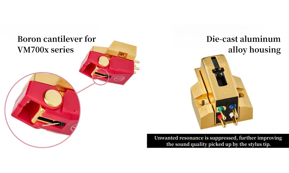 AT-VMx Series: Headshell-mounted model equipped with a Nude Microlinear stylus, delivering outstanding midrange richness and musical expression.