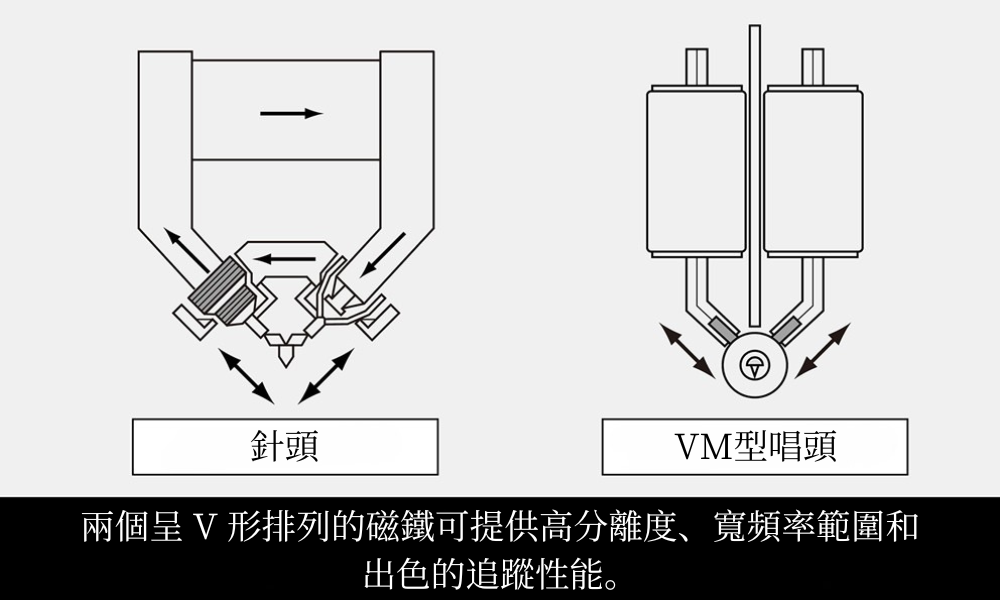 以往的VM型唱頭,在將唱針放到唱片上時,有聽眾反映針尖難以看清。本次型號在確保與舊型號的兼容性(替換針・機身)的同時,在保護蓋上新增了V型切口作為針尖位置的導引,提高了針尖的可視性。