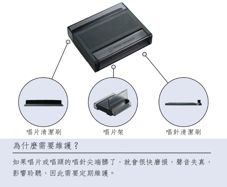 可保養黑膠唱片和唱針。 三合一工具,內建外套支架。