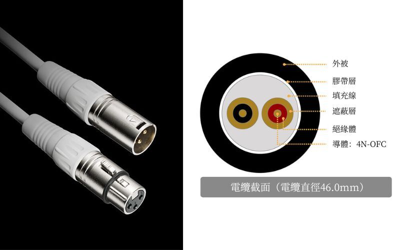 | 接頭類型 | 3針 XLR-F(母) - 3針 XLR-M(公) (Pin 1:GND,Pin 2:HOT,Pin 3:COLD) |
